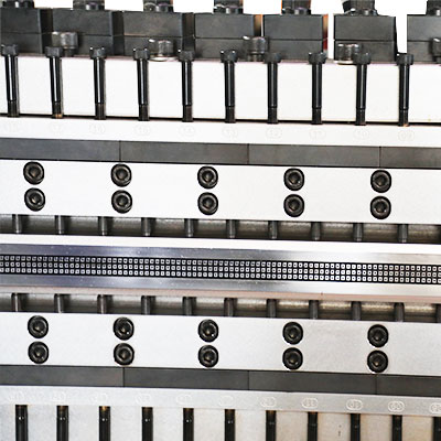衣架式結構平板模具。 在模唇部可得到連續無阻攔的流面,裝有微小間隔的調節螺釘對樹脂的壓力與金屬的上下反彈起作用,可彎曲模唇以調節模口間隙。 帶有活動模口 ,可進行粗調。