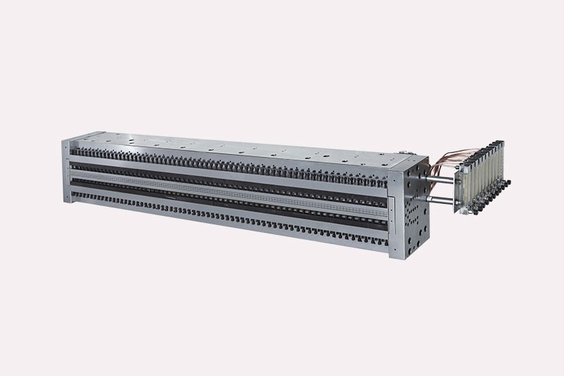 模具帶有上、下彈性微調橫唇可調節制品壁厚誤差£3%;全封閉內置式電熱管分區控制,加熱迅速,溫差?。荒却禋鈾C構獨立分區控制流量,配氣均勻使 制品更穩定;橫膠及芯棒采用精度高達0.015-0.03um的精拋光工藝,確保物料流暢